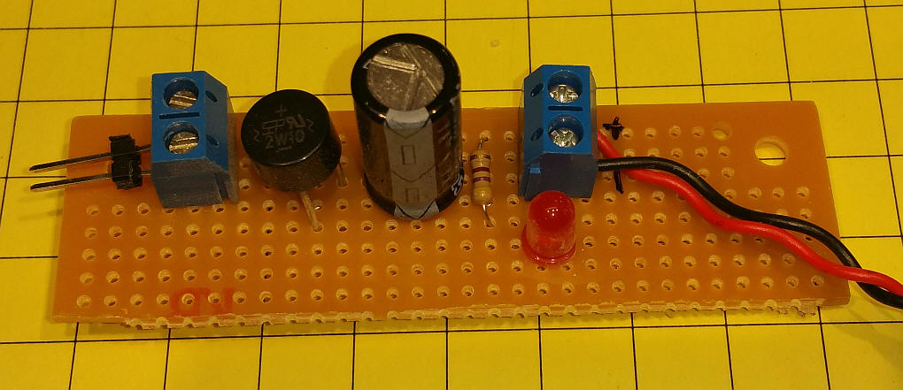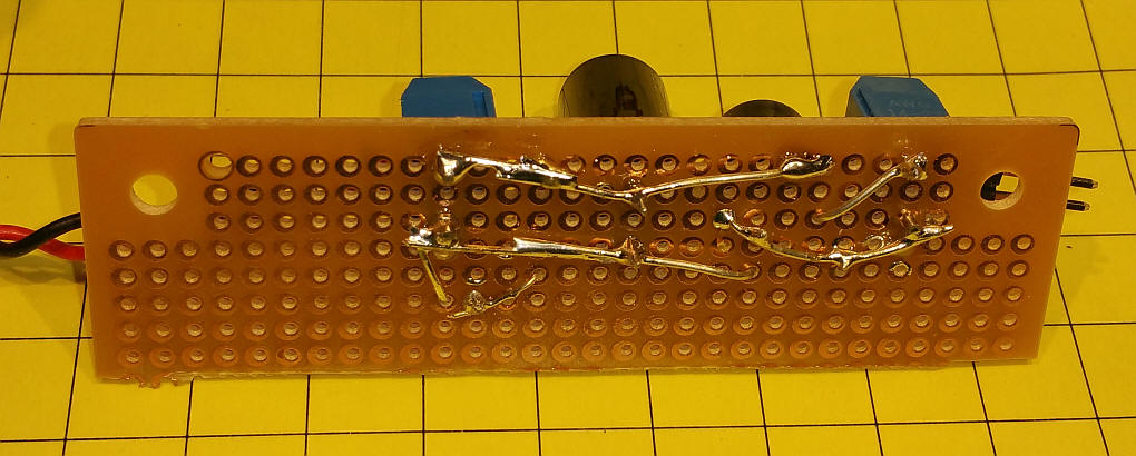 Here is the finished circuit, top and bottom view. The power from the accessory bus comes in at the left and DC comes out at the right.