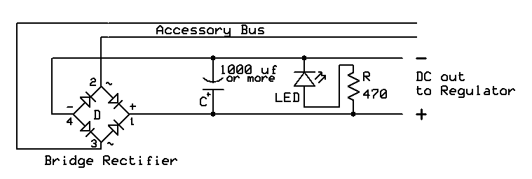 To tap into and use this power on your module it is suggested that you use a simple circuit composed of a bridge rectifier and filter capacitor. This has several advantages. First, it allows you to ignore polarity on the accessory bus. In addition it allows us to, in the future, run the bus with AC.